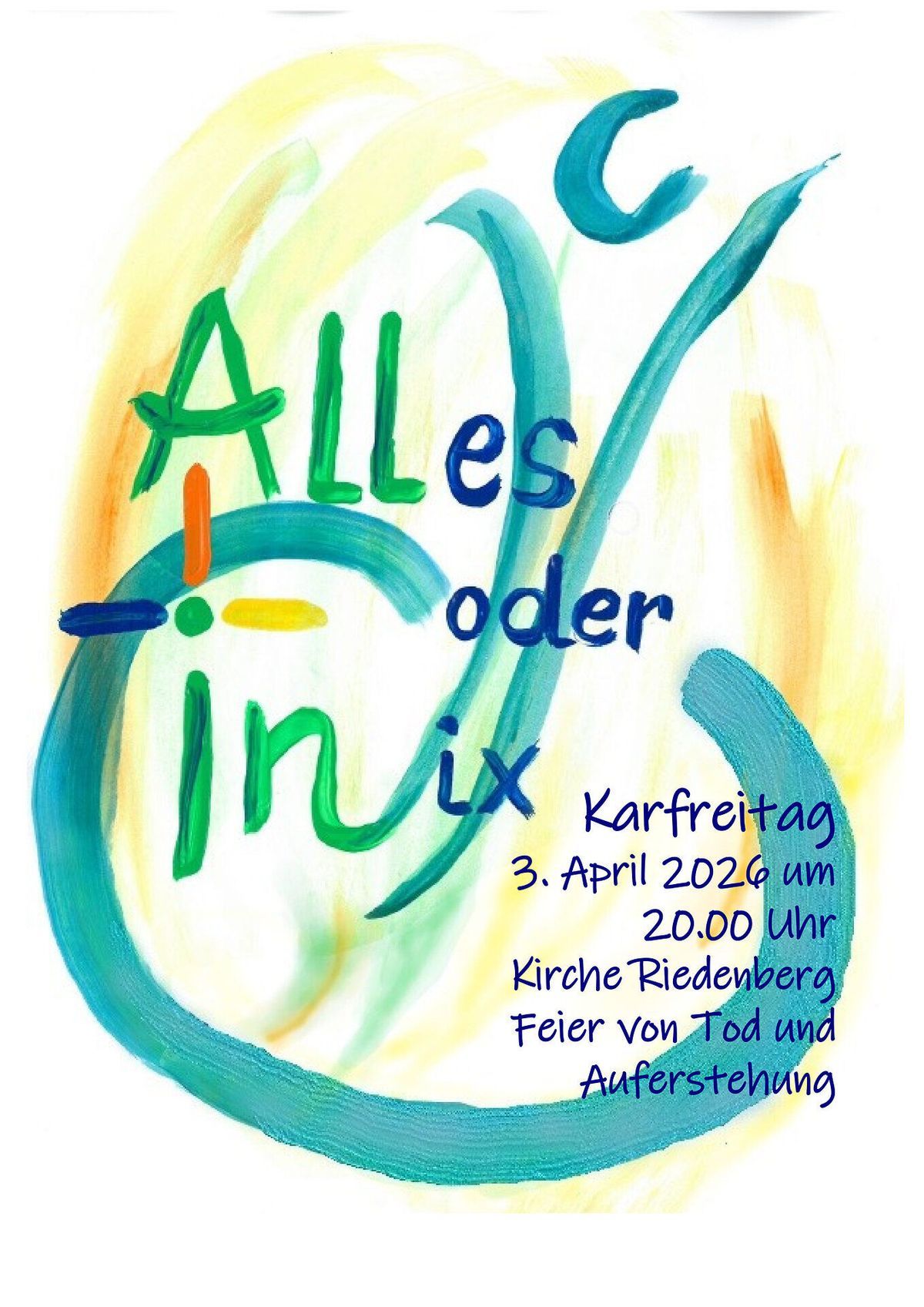 Am Karfreitag, 3. April, um 20 Uhr wird dabei der Mensch von der Schöpfung des Adam und der Eva bis zur Neuwerdung in der Auferstehung Jesu gekennzeichnet. Schon seit Jahren versuche „All In“, am Karfreitagabend die gesamte Passionsgeschichte in einer Feier abzubilden und so eine neue und ansprechende Form eines österlichen Gottesdienstes erlebbar werden zu lassen, heißt es in einer Pressemitteilung. In diesem Jahr bilden Lieder aus dem Neuen Geistlichen Lied den roten Faden, die in Korrespondenz mit den biblischen Texten gebracht werden. Mehr als bisher sollen die Mitfeiernden durch symbolische Handlungen in das Geschehen einbezogen werden. Warme Kleidung wird empfohlen.