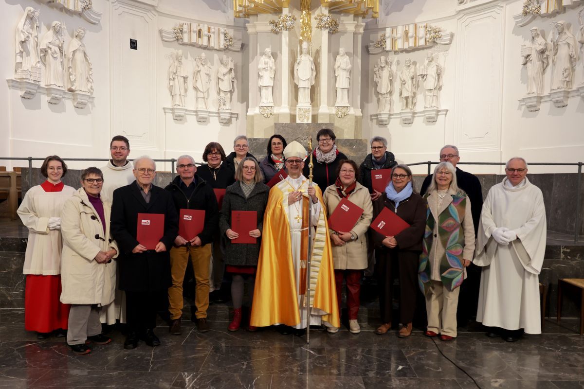 Dann überreichte Bischof Jung die Urkunden. Im Gebet erbat die Gemeinde den Segen Gottes für die Neubeauftragten. Eine Begegnung im Burkardushaus schloss sich an.