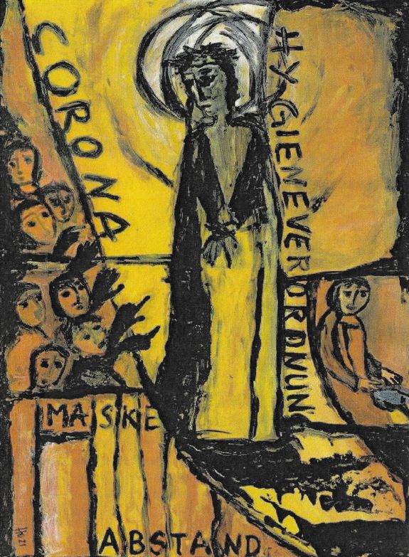 Oberwildflecken/Bad Brückenau (POW) Mit einem Corona-Kreuzweg will die Künstlerin Doris Hopf aus Riedenberg im Landkreis Bad Kissingen der Schwierigkeit des Lebens in Zeiten der Pandemie die Hoffnung entgegensetzen. Zu sehen sind die Bilder an den Kartagen in der Kirche in Oberwildflecken sowie an der evangelischen Friedenskirche in Bad Brückenau. Sie werden jeweils per Beamer gezeigt. Um zum Verweilen, Beten und Nachdenken einzuladen, werden die Bilder mit Orgelmusik untermalt, die Dekanatskantor Markus Wollmann an der Orgel der Stadtpfarrkirche Bad Brückenau eingespielt hat. Wollmann interpretiert die einzelnen Stationen mit Chorälen und Liedern aus verschiedenen Jahrhunderten. Das ökumenische Vorbereitungsteam will mit dieser Aktion einen Beitrag zur Verkündigung leisten. Die Menschen sollen in den pandemischen Zeiten spüren, nicht alleingelassen zu sein, heißt es in einer Pressemitteilung.