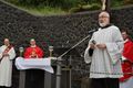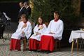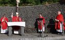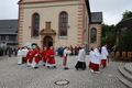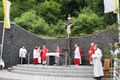 Kloster Kreuzberg (POW) Die Haltung der Barmherzigkeit hat Bischof Dr. Franz Jung am Montagabend, 5. Juli, beim Kiliani-Pontifikalgottesdienst auf dem Kreuzberg, als unverzichtbar bezeichnet: „Nur wer fühlt, was er sieht, tut, was er kann.“ Mit rund 110 Gläubigen feierte der Bischof auf dem Platz vor der Wallfahrtskirche auf dem Kreuzberg (Landkreis Rhön-Grabfeld) die erste regionale Messe der coronabedingt auch in diesem Jahr modifizierten Wallfahrtswoche. „Wenn es nicht möglich ist, dass die Menschen zu Kiliani nach Würzburg kommen, kommt Kiliani zu den Menschen“, sagte er. Es sei schön, sich Jahr für Jahr auf die Glaubenswurzeln zu besinnen. Eingeladen waren zu dem Gottesdienst insbesondere Politiker und Mitglieder kirchlicher Räte. Mit dem Bischof standen die Dekane der drei angrenzenden Dekanate am Freialtar, Armin Haas (Dekanat Hammelburg), Stephan Hartmann (Dekanat Bad Kissingen) und Dr. Andreas Krefft (Dekanat Rhön-Grabfeld). Sie und alle Gläubigen begrüßte Franziskanerpater Korbinian Klinger, Guardian des Klosters auf dem Kreuzberg, zu Beginn der Feier. Auch die äußeren Bedingungen passten: War der Heilige Berg der Franken anfangs wolkenverhangen, so gab es zum Schlusssegen Sonnenschein und blauen Himmel.