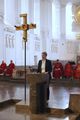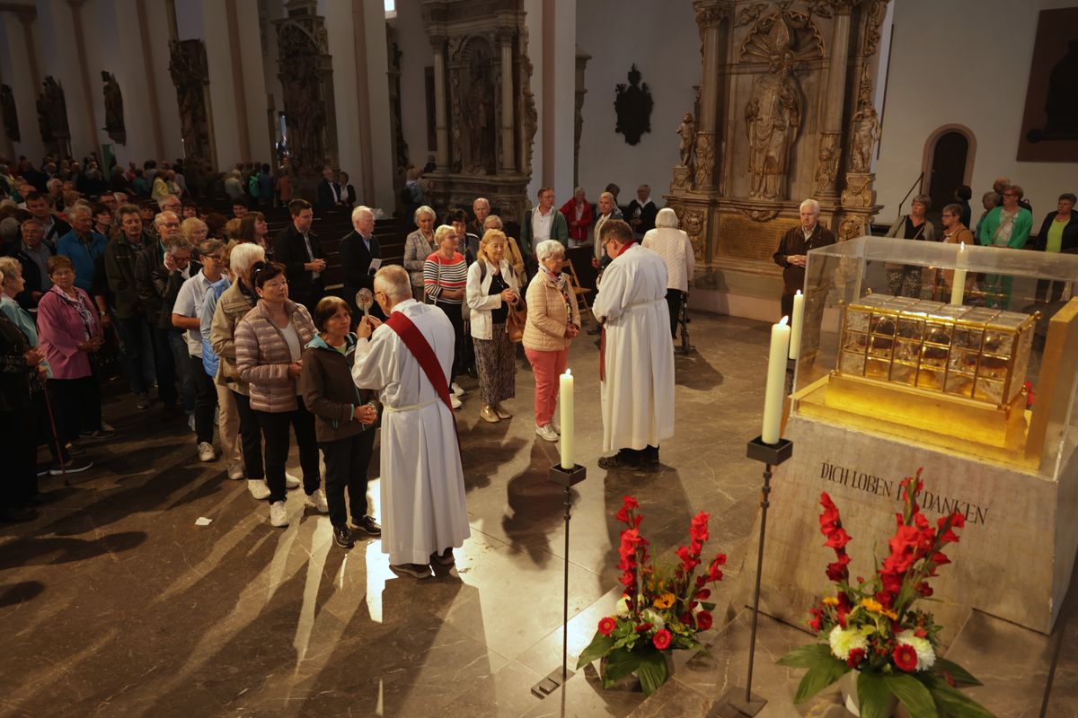 Am Ende des Gottesdiensts lud Dominik Großmann, Referent für den Katholikentag 2026, dazu ein, die Großveranstaltung in Würzburg vom 13. bis zum 17. Mai 2026 zu nutzen, um anderen Gläubigen zu begegnen, das Wort Gottes neu zu entdecken und miteinander Gottesdienst zu feiern. Nach dem Schlusssegen nutzten viele die Gelegenheit, sich einzeln unter Auflegen von Reliquien der Frankenapostel segnen zu lassen. Auf dem Kiliansplatz tauschten sich die Wallfahrer bei kühlen Getränken aus und besuchten den Infostand des Katholikentags.