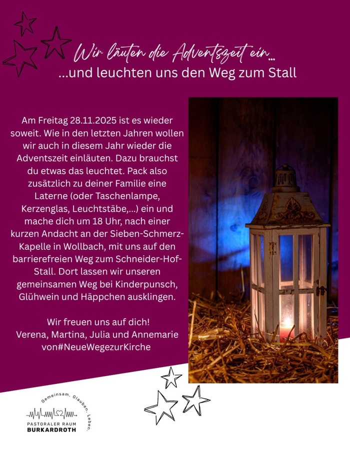 Am Freitag 28.11.2025 ist es wieder sowei. Wie in den letzten Jahren wollen wir auch in diesem Jahr wieder die Adventszeit einläuten. Dazu brauchts du etwas das leuchtet. Pack also zusätzlich zu deiner Familie eine Laterne (oder Taschenlampe, Kerzenglas, Leuchtstäbe,...) ein und mache dich um 18 Uhr, nach einer kurzen Andacht an der Sieben-Schmerz-Kapelle in Wollbach, mit uns auf den barrierefreien Weg zum Schneider-Hof-Stall. Dort lassen wir unseren gemeinsamen Weg bei Kinderpunsch, Glühwein und Häppchen ausklingen.